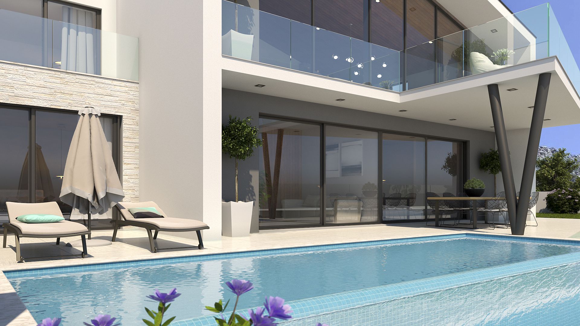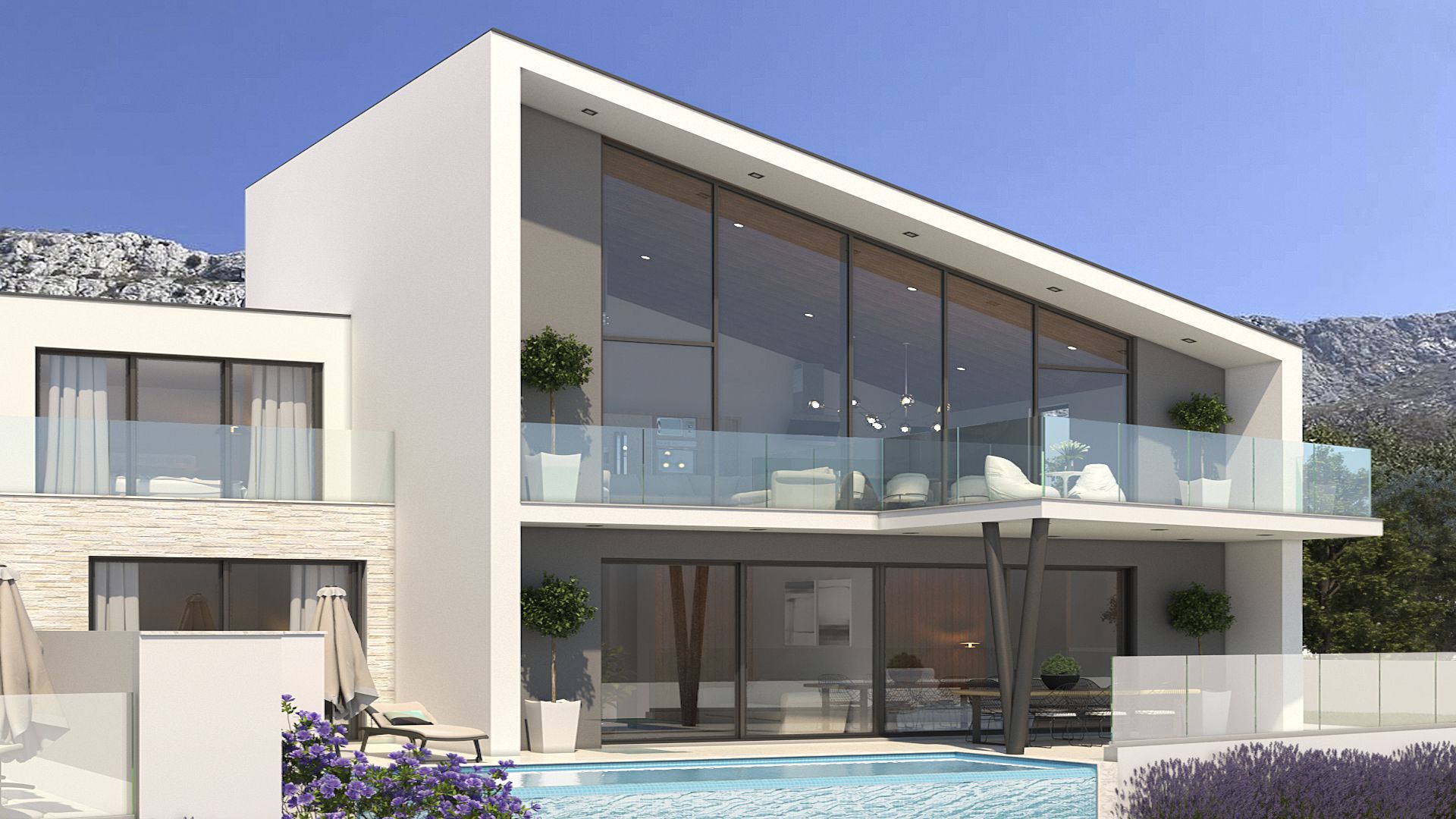 Die Villa Flower ist eine Doppelhaushälfte. Die Architektur des Doppelhauses ist sehr schön. Die Verbindung der beiden Doppelhaushälften besteht lediglich zwischen dem Mittelbau und den darüber liegenden beiden Schlafzimmern. Aufgrund der tollen Architektur, haben wir im Obergeschoss beeindruckende Raumhöhen und das in Kombination mit einem atemberaubenden Meerblick.