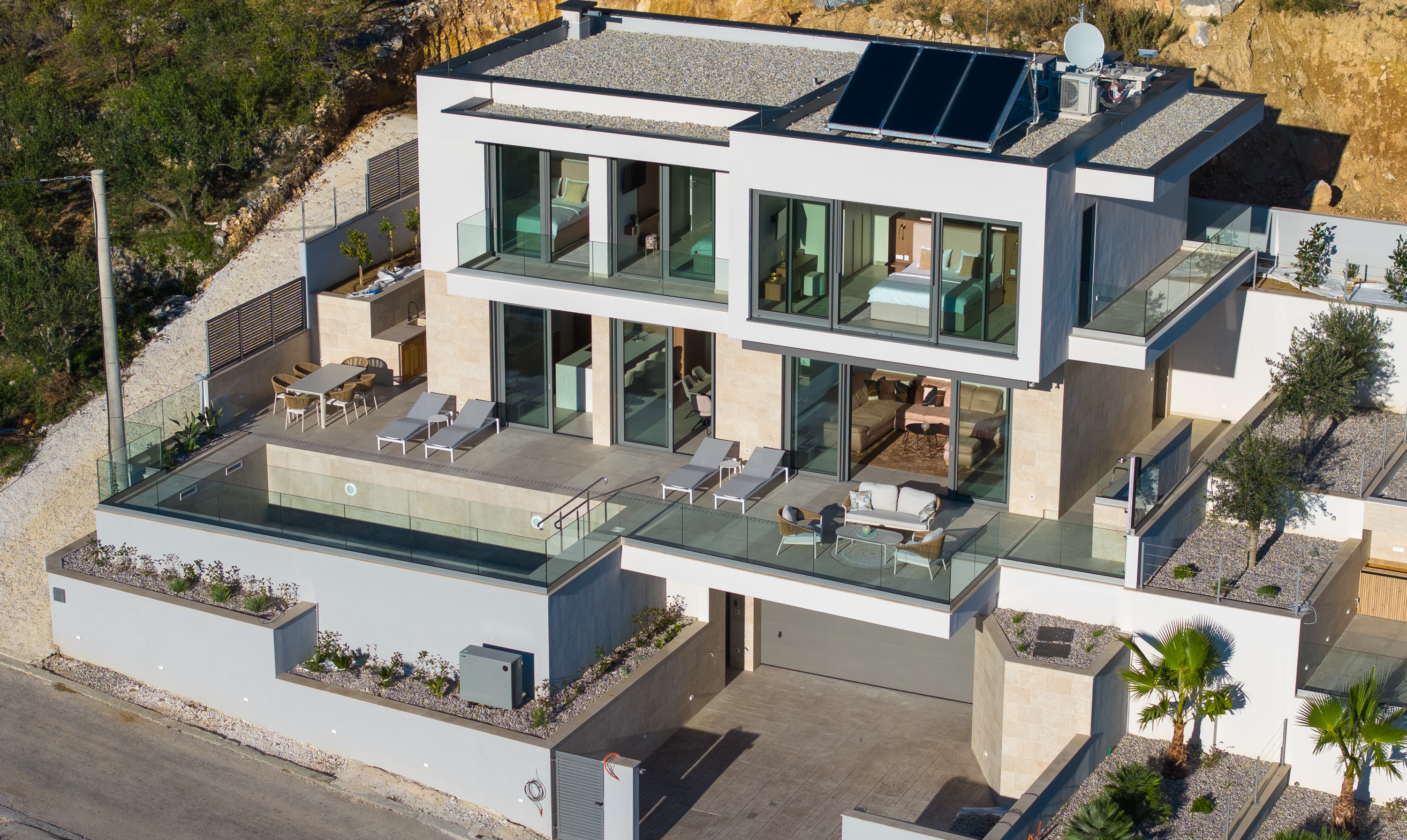 Die Villa Sirocco befindet sich unten links auf dem Grundstück. Über eine elektrische Schiebetoranlage gelangt man auf das Grundstück und auf Niveau der Straße befindet sich die Garage und die PKW Stellplätze. Darüber liegt die Wohnebene der Villa mit dem Pool, so dass ein traumhafter und unverbaubarer Blick auf das Meer und die vorgelagerten Inseln garantiert ist.