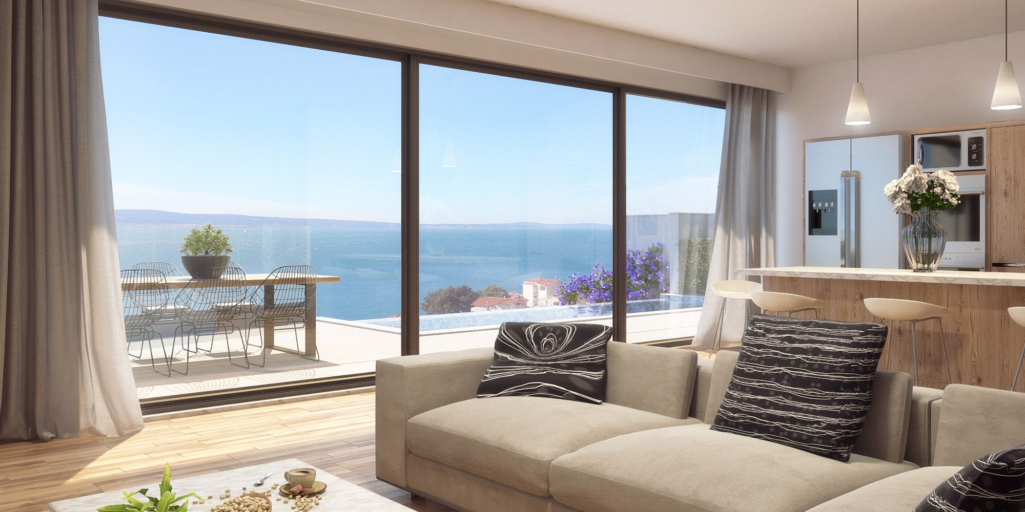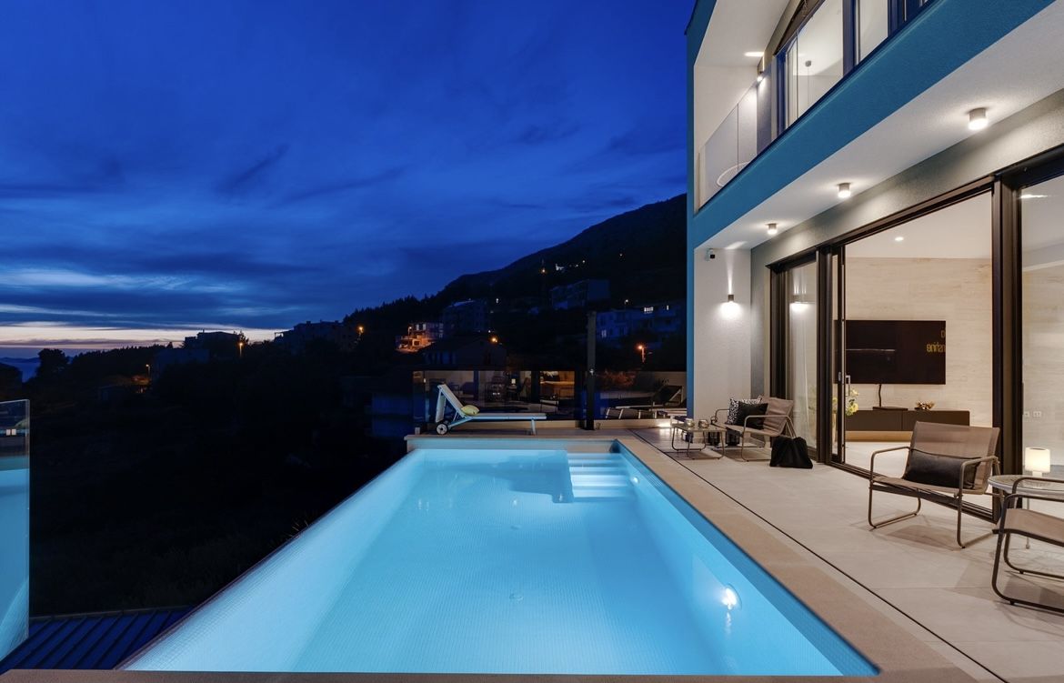 Die Villa Sunshine ist die zweite Doppelhaushälfte. Der Unterschied zur Cecilie besteht aufgrund der Grundstückssituation darin, dass die Grundfläche der DHH mehr in die Breite geht, was den schönen Effekt hat, dass die große Wohnküche und das Wohnzimmer nebeneinander zur großen Fensterfront positioniert werden konnten. So öffnet man die Schiebeelemente und hat die direkte Verbindung zur Terrasse und zum Pool.