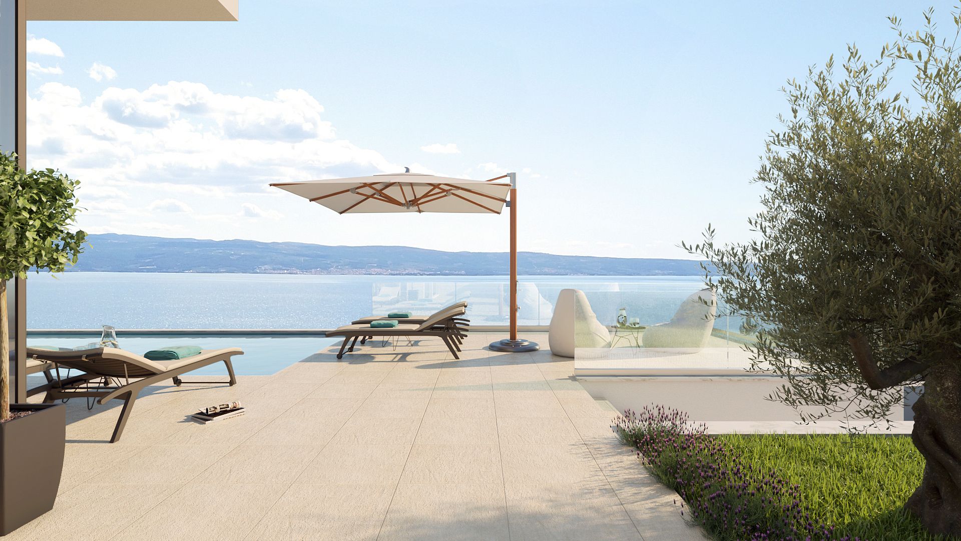große Schlafzimmer, ein eigener Fitnessbereich mit Sauna und Whirlpool, eine traumhafte Sommerküche mit dalmatinischem Steingrill und einen großzügigen Terrassenbereich auf unterschiedlichen Höhen. Aufgrund der Größe des Grundstückes, verfügt die Anlage über mehrere mediterran angelegten Gärten und Grünflächen.