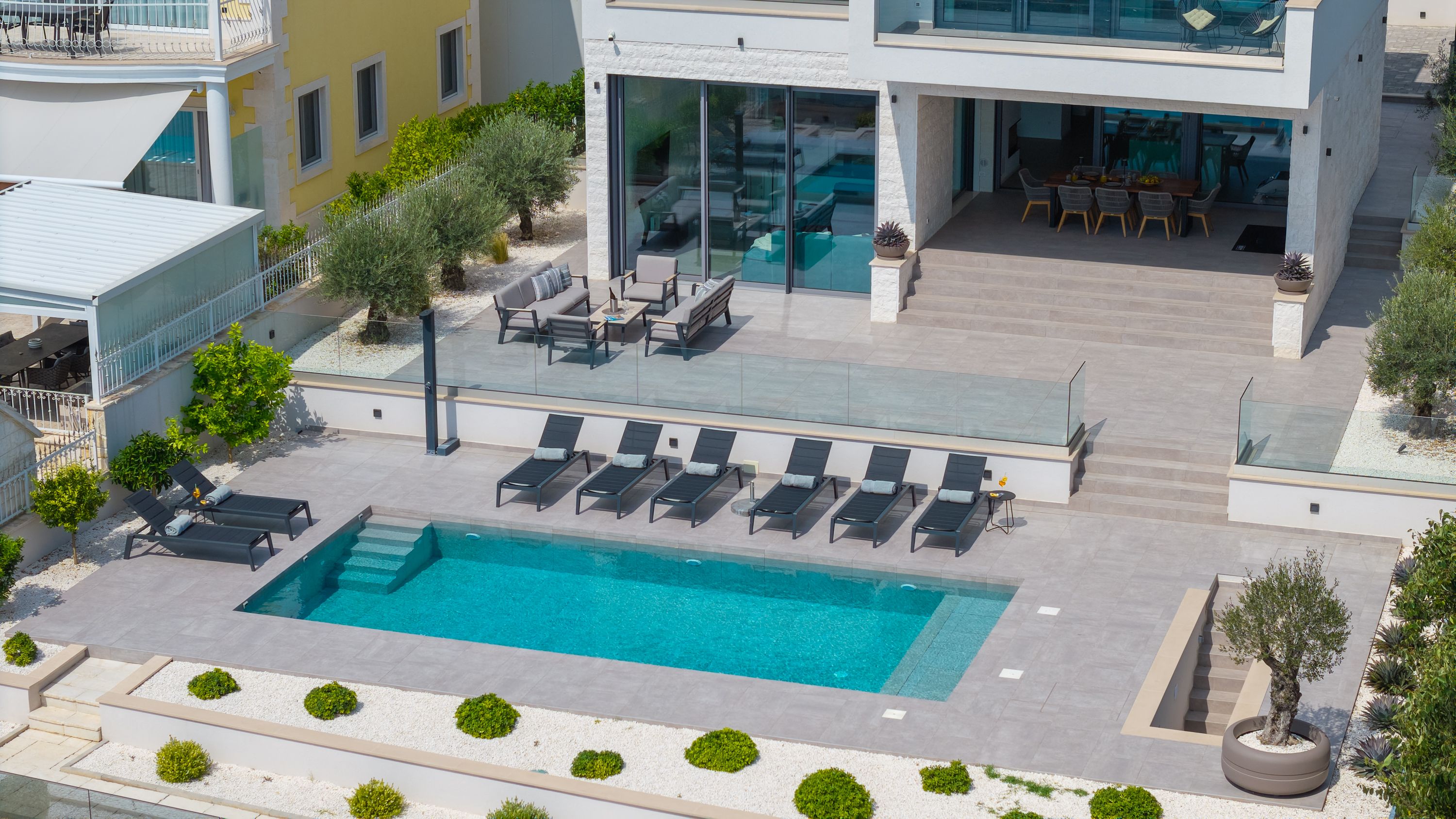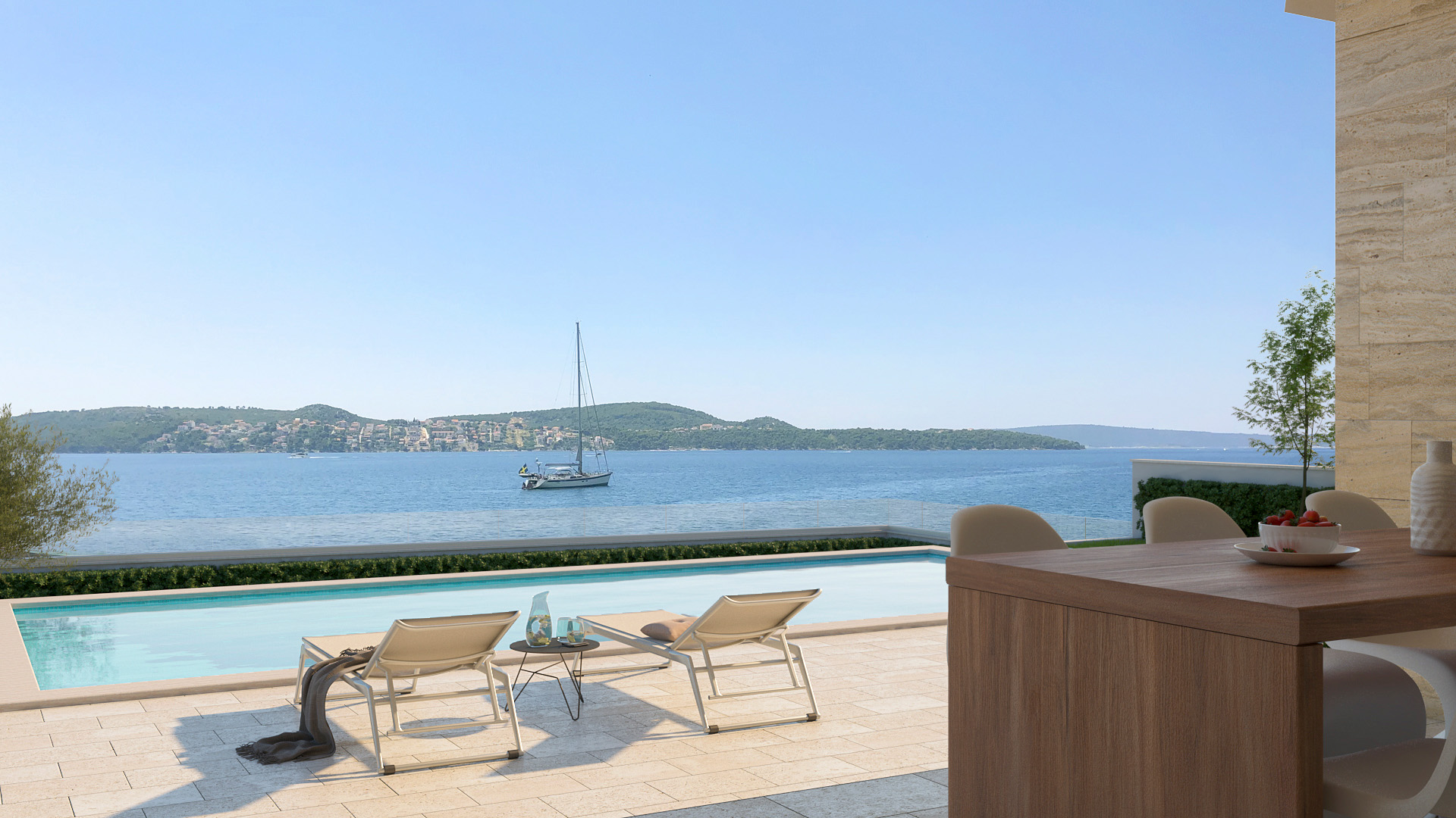 Auch bei dieser Villa in der Nähe von Trogir, handelt es sich auch um eine 1. Reihe zum Strand.