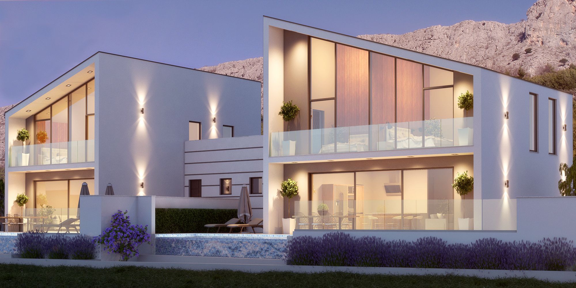 Die Villa Sunshine ist die zweite Doppelhaushälfte. Der Unterschied zur Cecilie besteht aufgrund der Grundstückssituation darin, dass die Grundfläche der DHH mehr in die Breite geht, was den schönen Effekt hat, dass die große Wohnküche und das Wohnzimmer nebeneinander zur großen Fensterfront positioniert werden konnten. So öffnet man die Schiebeelemente und hat die direkte Verbindung zur Terrasse und zum Pool.