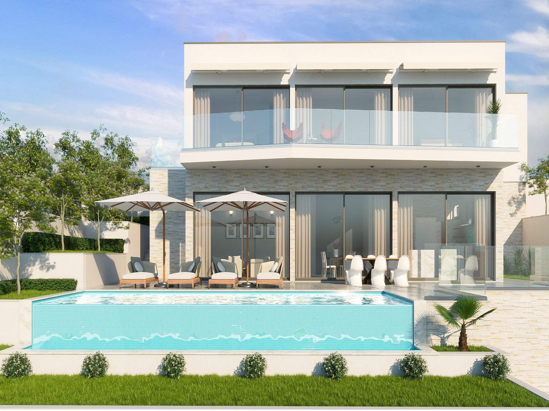 Die Villa Catherine steht zwar über der Anastasia in der 2. Reihen, aber aufgrund der Hangsituation des Grundstückes, hat auch diese Villa einen hervorragenden Blick auf die Bucht von Kanica. Zum Badestrand gelangt man in wenigen Metern über die private Straße der Anlage.